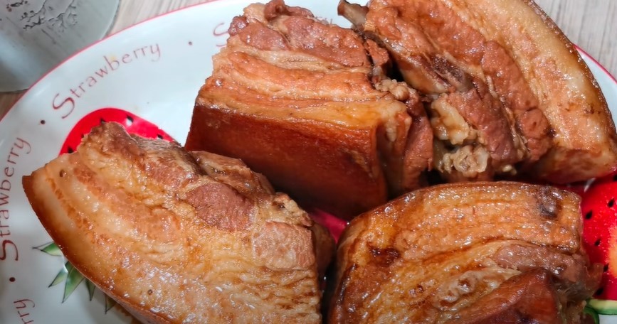 Заливаємо грудинку соєвим соусом так, щоб він покрив м’ясо, доводимо до кипіння, зменшуємо вогонь, накриваємо кришкою і готуємо 1 годину. Періодично перевертайте шматки, щоб добре і рівномірно проварювалися.